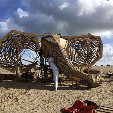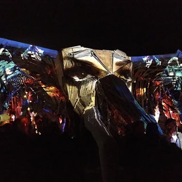 The burning of the elephant became a collective ritual that brought hundreds of people together in a moment of celebration and release. Children could place a drawing or a message on it's ears. A video-mapping artist created beautiful visuals on the wooden structure. Then, the fire was released onto the elephant. The ritual created a shared experience that created connection at the very moment a community was saying goodbye. Circular making, collaboration and impermanence came together in one powerful, unforgettable experience.